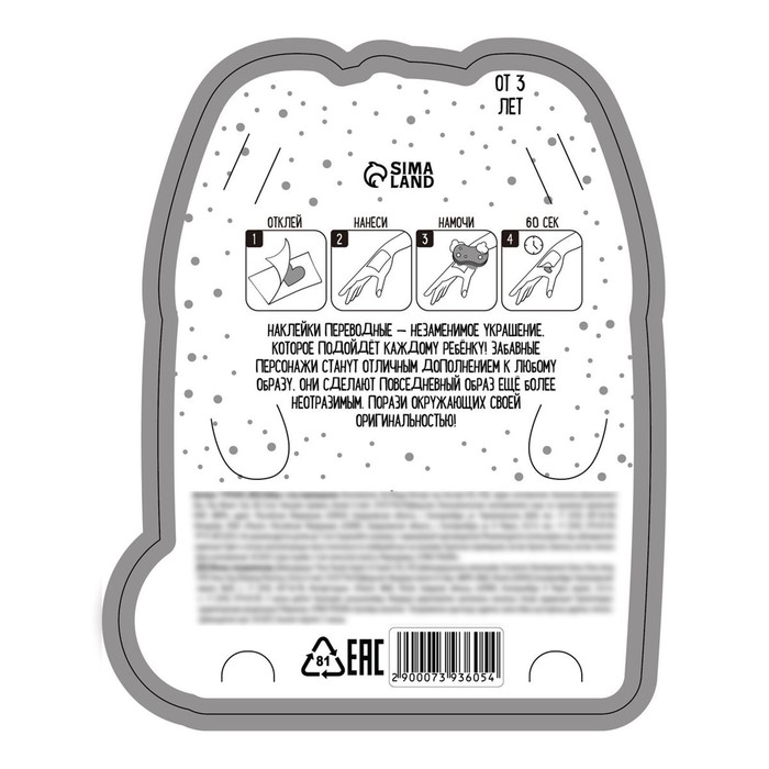 Внимание! Возможна индивидуальная реакция на участке нанесения татуировки. Рекомендуем следить за состоянием кожи в период использования. После снятия татуировки промойте кожу водой и нанесите тонкий слой увлажняющего крема.
