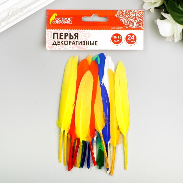 Перья декоративные прямые, 10-15 см (набор 24 шт) 6 цветов, яркие, ассорти