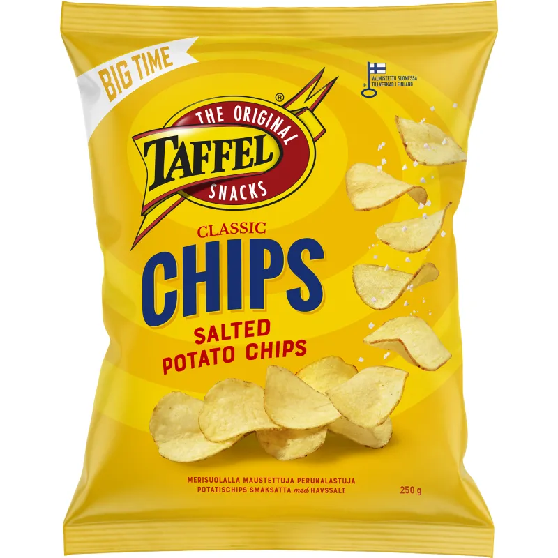 Хрустящие и гладкие картофельные чипсы Taffel изготавливаются только из лучших и сочных картофелин. Секрет вкуса этих золотистых чипсов заключается в качественной смеси растительных масел и точной щепотке морской соли. Эти первые в Финляндии чипсы отлично подходят и для дипов. Упаковка 250 г. Мы постоянно обновляем информацию о продукте. Однако, мы всегда рекомендуем проверять данные на упаковке.