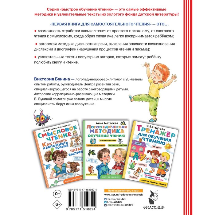 Эта книга — незаменимый помощник для начинающих читателей. Произведения В. Бианки, С. Маршака, Э. Успенского и других знаменитых писателей подарят радость от общения настоящей литературой, воспитают хороший вкус, чувство языка. Тексты распределены так, чтобы ребёнок постепенно перешёл от слогового к смысловому чтению. Увлекательные истории покажут маленькому читателю красоту родного края, научат дружить, сделают непосед более усидчивыми. Диагностические упражнения Виктории Буниной – логопеда-нейрореабилитолога с 20-летним стажем работы – помогут выявить возможные нарушения навыков чтения и письма.