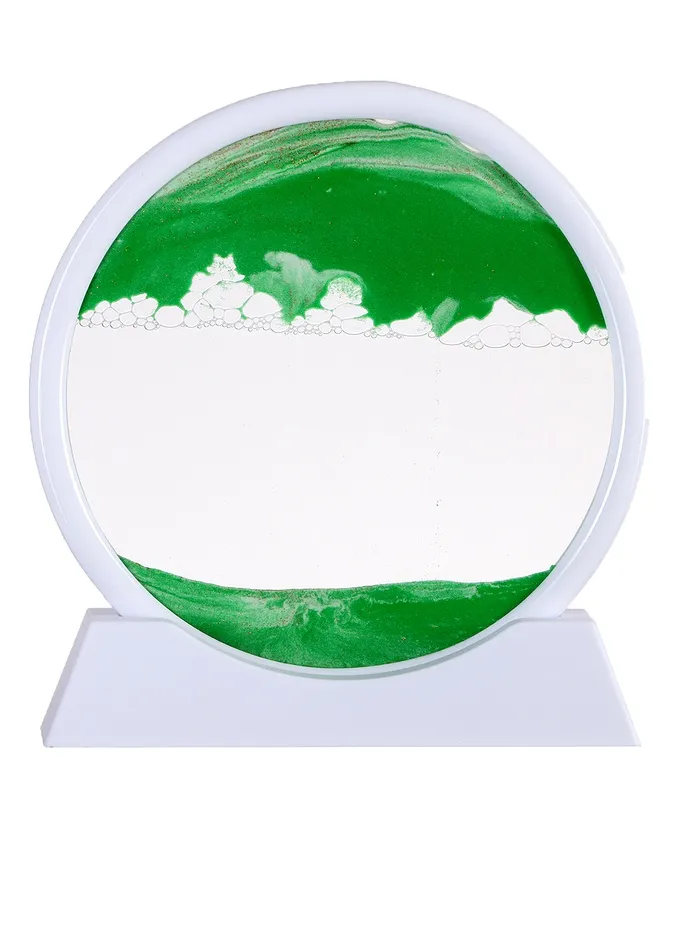 Вы воздействуете одним прикосновением, когда рамка переворачивается, песок начинает произвольно струиться вниз, огибая пузырьки жидкости, образуя удивительной красоты пейзажи. Наблюдение за этим процессом позволяет человеку расслабиться, отдохнуть, успокоить нервы.