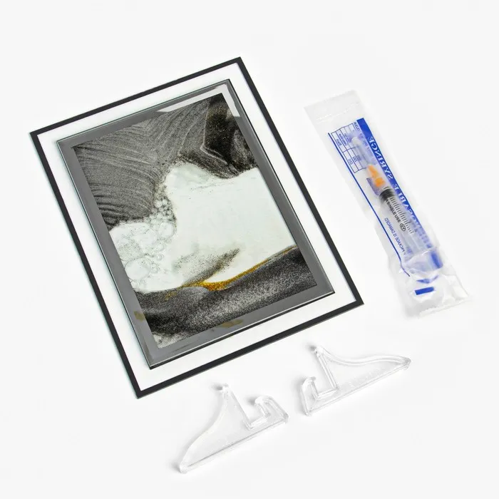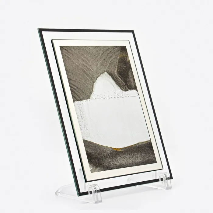 Вы воздействуете одним прикосновением, когда рамка переворачивается, песок начинает произвольно струиться вниз, огибая пузырьки жидкости, образуя удивительной красоты пейзажи. Наблюдение за этим процессом позволяет человеку расслабиться, отдохнуть, успокоить нервы.
