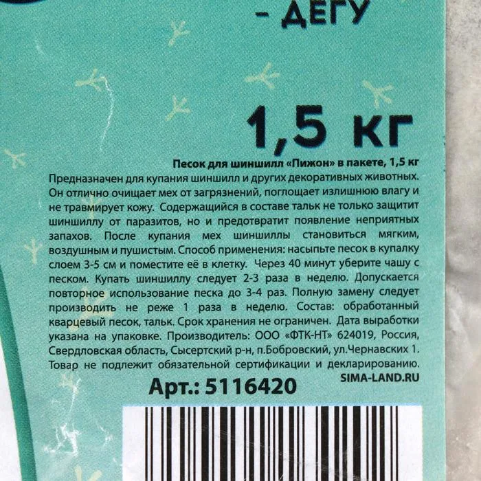 Песок предназначен для купания шиншилл и других декоративных животных. Шиншиллы обладают самым плотным мехом в мире животных. При этом у шиншилл отсутствуют потовые и сальные железы. В природе для избавления от накопившейся влаги, удаления выпавших волос и очистки меха шиншиллы регулярно купаются в вулканическом пепле и мелкой пыли. Купаются в песке не только шиншиллы, но и дегу, песчанки, а также хомяки.