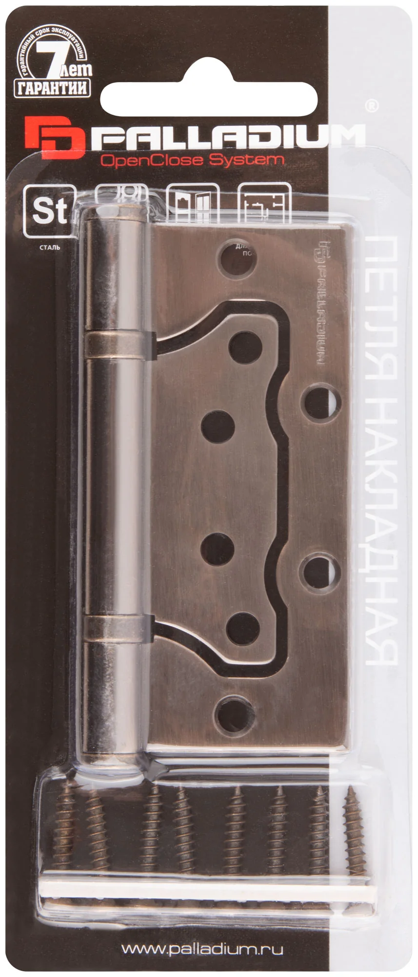 Изготовленная из инструментальной стали, петля имеет лаковое покрытие и оснащена двумя подшипниками качения, что обеспечивает плавное открытие и закрытие двери. Не требует врезки, что значительно ускоряет процесс монтажа.