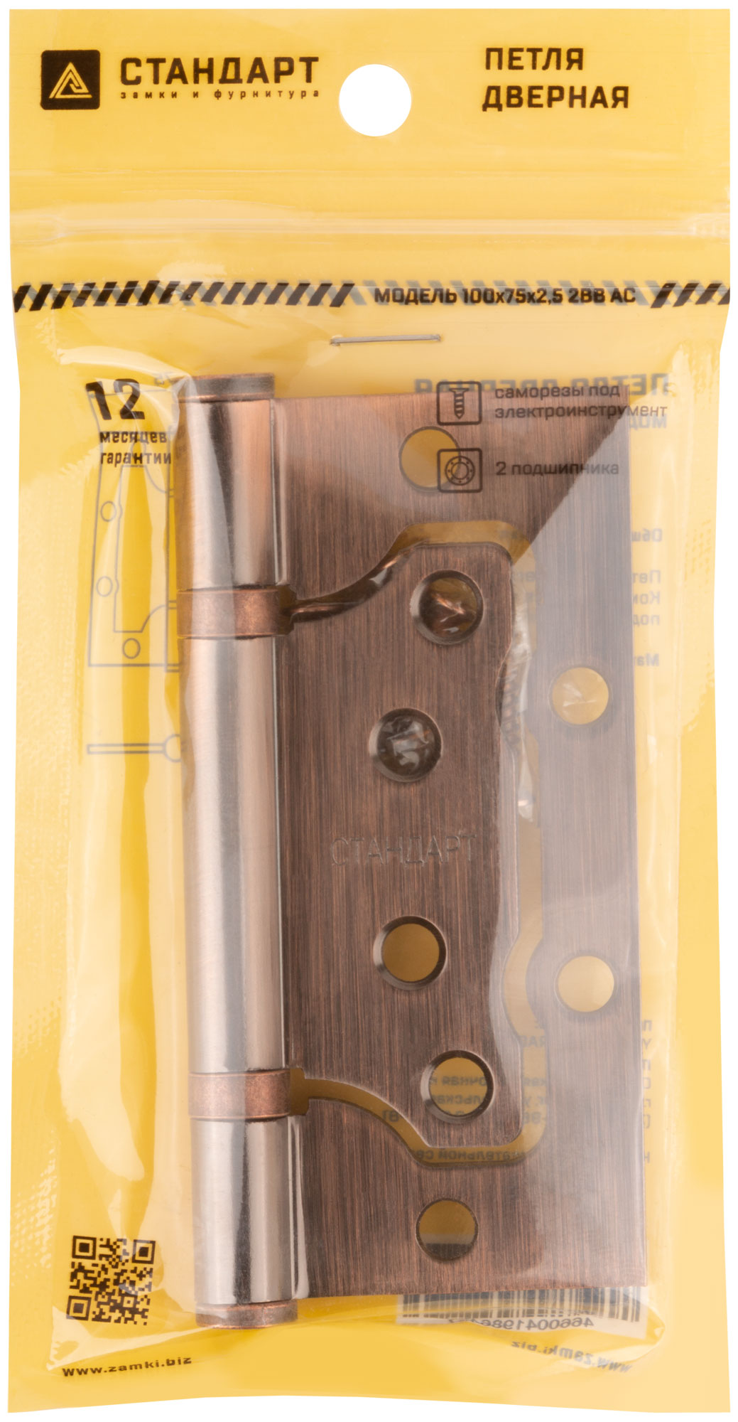Петля выполнена из стали с гальваническим покрытием, что обеспечивает защиту от коррозии и долговечность. Медное покрытие добавляет эстетичности и прекрасно сочетается с различными дверными конструкциями.