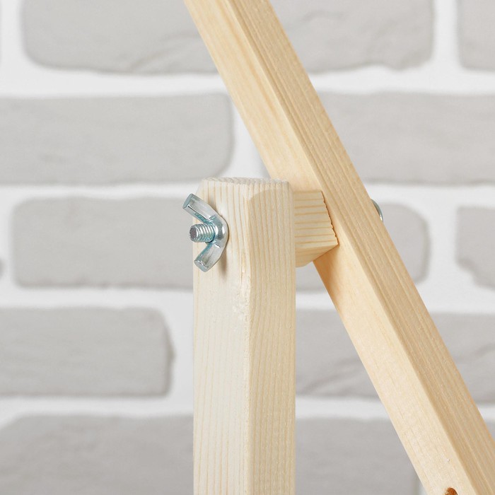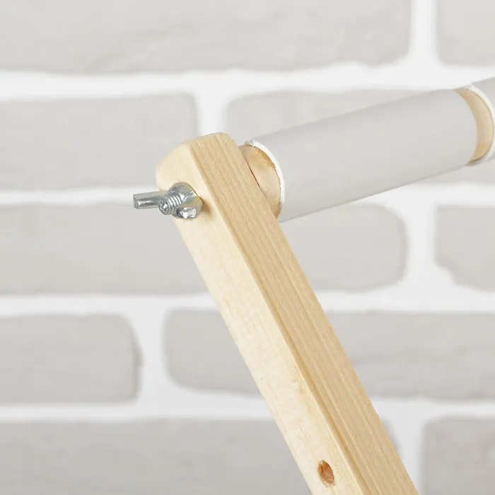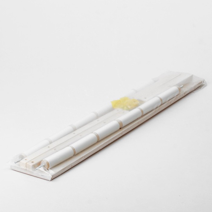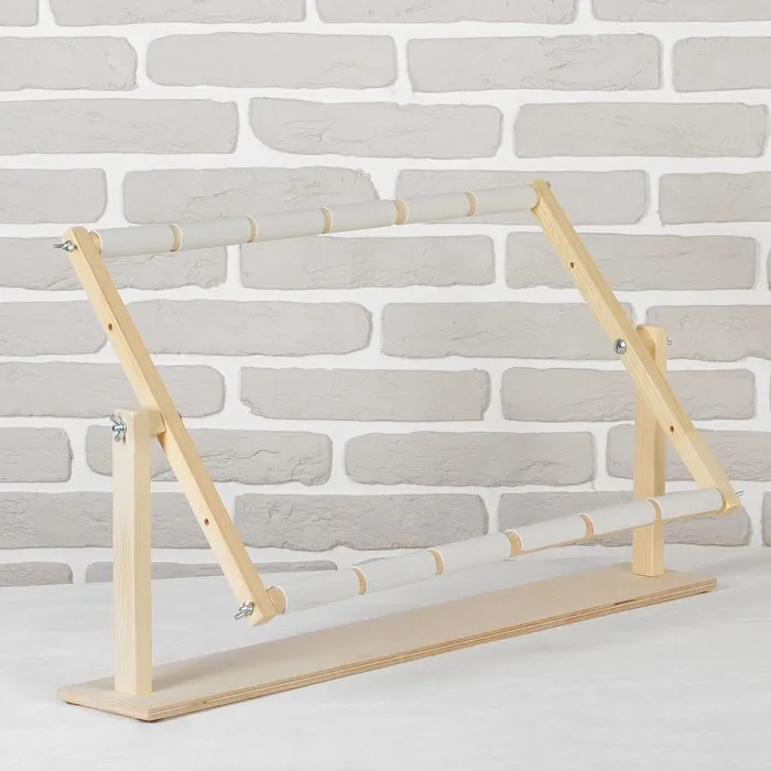 Рамка состоит из четырёх частей: двух передвижных круглых реек и двух прямоугольных боковин с отверстиями, расстояние между которыми различное. Это позволяет выбрать оптимальную ширину пяльцев. Размер варьируется: 30х60см, 20х60см.