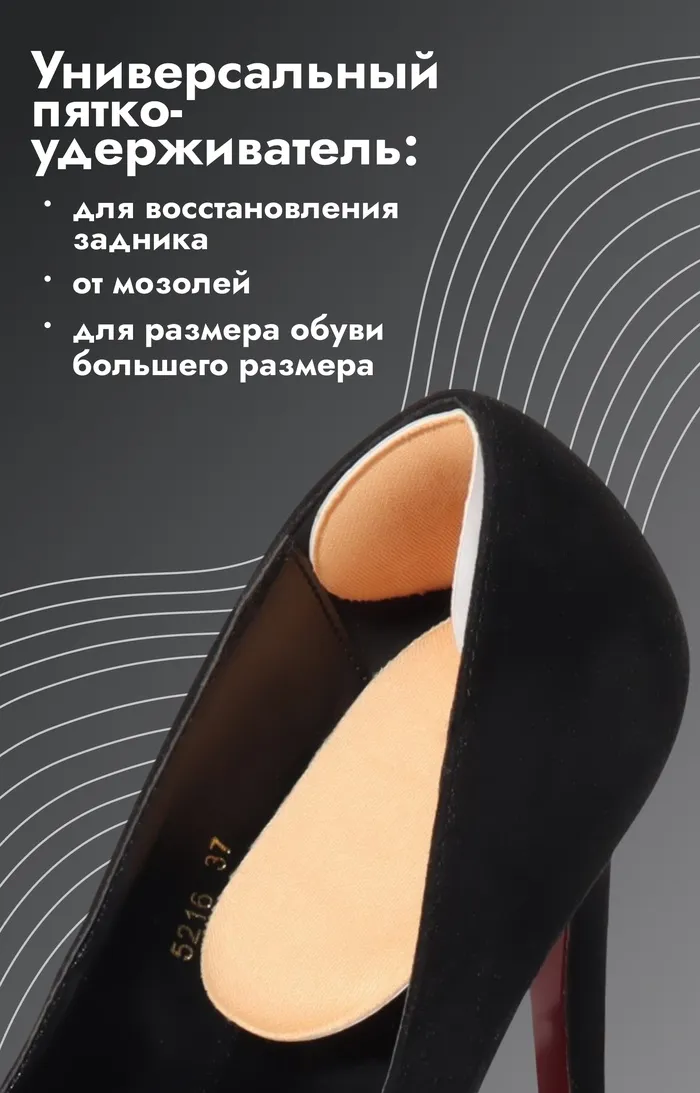 Обеспечивает максимальный комфорт при ношении обуви, уменьшают давление в области пятки. Подойдёт к любой обуви. Предотвратит появление мозолей и натоптышей.