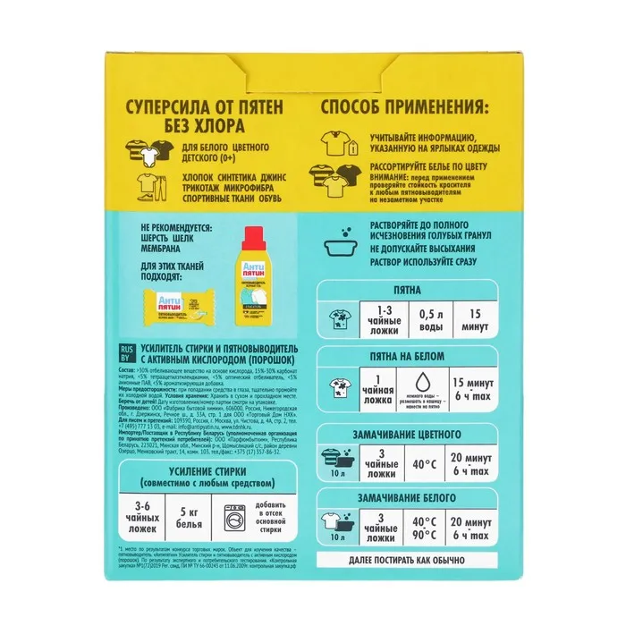 OXI формула. За счет высокого содержания активного кислорода удаляет трудновыводимые пятна и обеспечивает ослепительную белизну. Наличие в гранулах TAED компонента, необходимого для активизации кислорода при низких температурах, обеспечивает эффективное действие уже при температуре 40 °С. OXI формула. За счет высокого содержания активного кислорода удаляет трудновыводимые пятна и обеспечивает ослепительную белизну. Наличие в гранулах TAED компонента, необходимого для активизации кислорода при низких температурах, обеспечивает эффективное действие уже при температуре 40 °С. Удаляет трудновыводимые свежие и застарелые пятна кофе, чая, сока, чернил и т. д. Может использоваться для выведения локальных пятен, при замачивании, а также в качестве усилителя стирального порошка.
