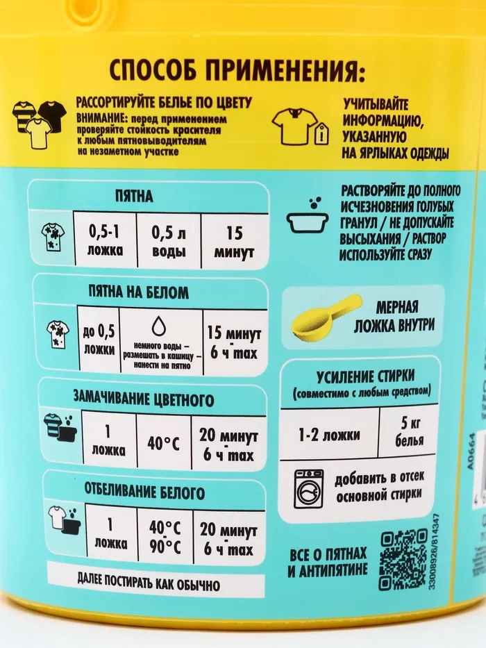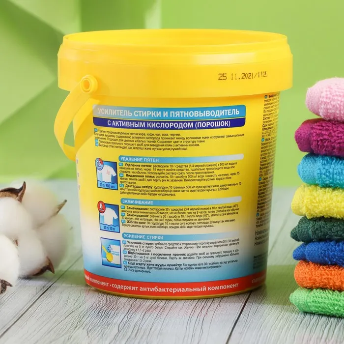 OXI формула. За счет высокого содержания активного кислорода удаляет трудновыводимые пятна и обеспечивает ослепительную белизну. Наличие в гранулах TAED компонента, необходимого для активизации кислорода при низких температурах, обеспечивает эффективное действие уже при температуре 40 °С. OXI формула. За счет высокого содержания активного кислорода удаляет трудновыводимые пятна и обеспечивает ослепительную белизну. Наличие в гранулах TAED компонента, необходимого для активизации кислорода при низких температурах, обеспечивает эффективное действие уже при температуре 40 °С. Удаляет трудновыводимые свежие и застарелые пятна кофе, чая, сока, чернил и т. д. Может использоваться для выведения локальных пятен, при замачивании, а также в качестве усилителя стирального порошка.