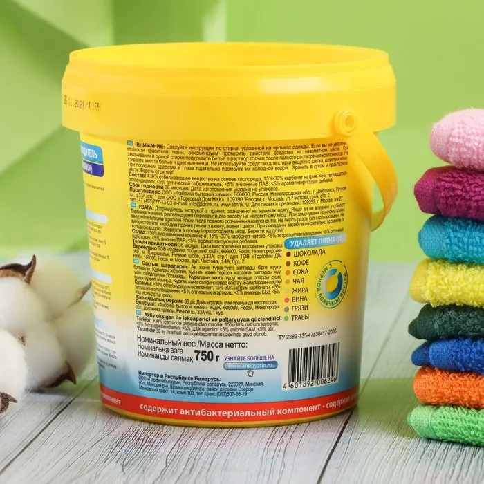 Состав: 30% отбеливающее вещество на основе кислорода, 15%-30% карбонат натрия, <5% тетраацетилэтилендиамин, <5% оптический отбеливатель, <5% анионные ПАВ, <5% ароматизирующая добавка.