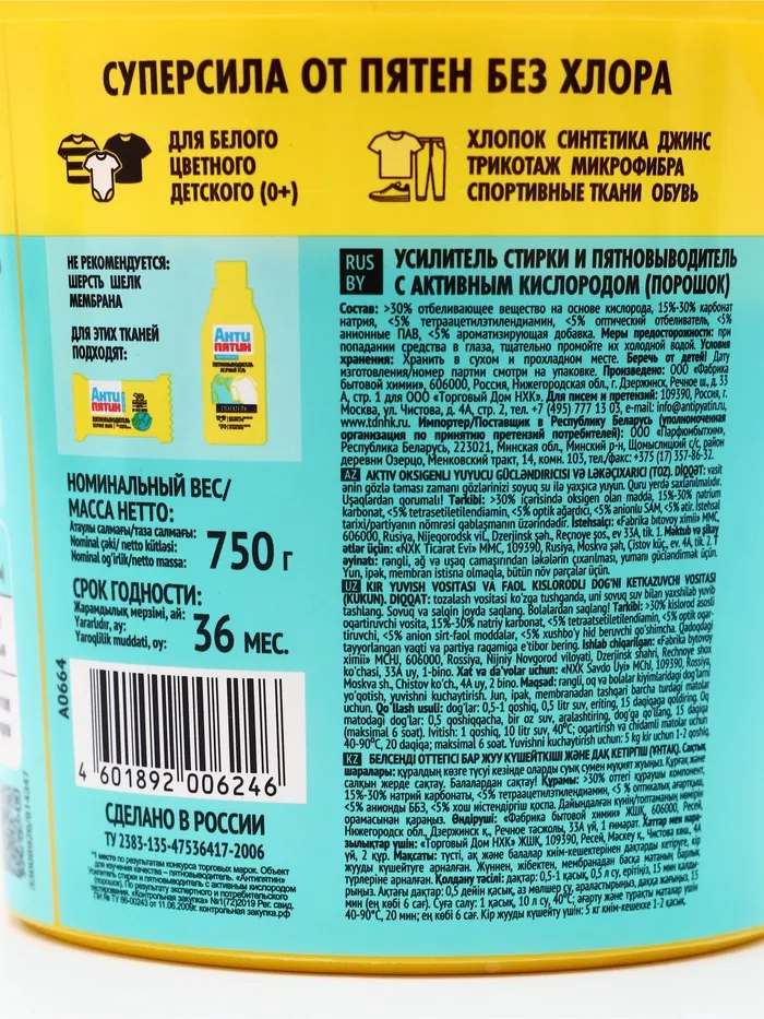 Пятновыводитель Антипятин активный кислород, концентрат, ведро, 750 гр — Характеристики