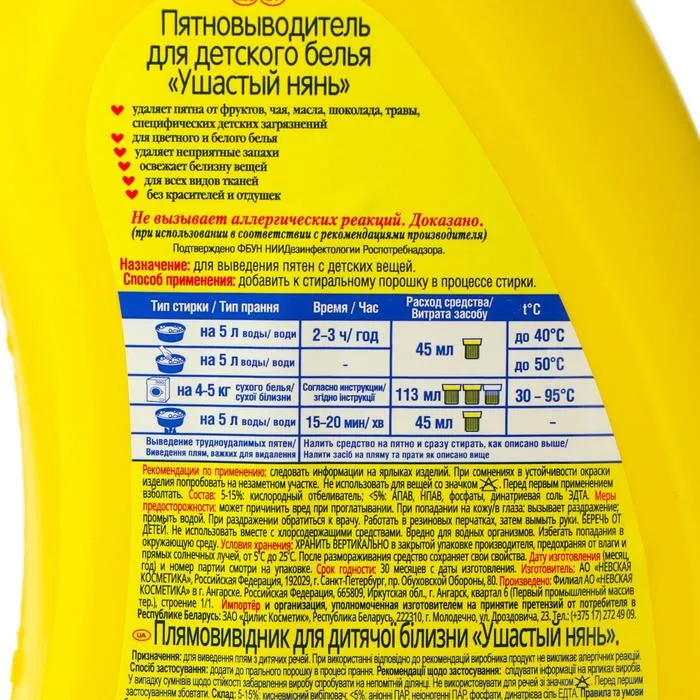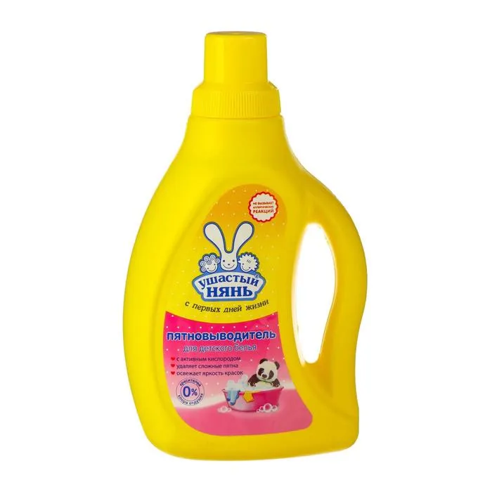 «Ушастый нянь» эффективно удаляет «детские» пятна и запахи с одежды и постельных принадлежностей. Средство подходит для обработки вещей детей любого возраста.