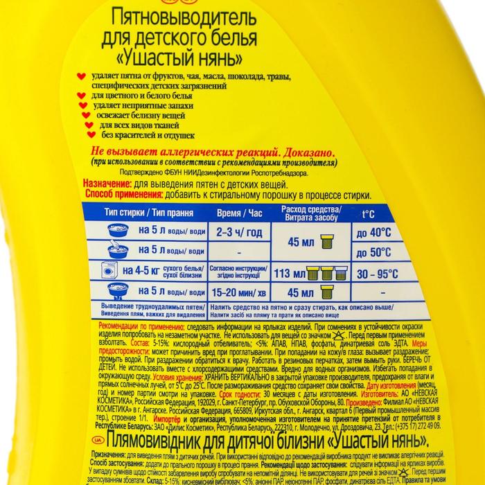 Пятновыводитель для детского белья Ушастый нянь, без хлора, 750 мл — Характеристики