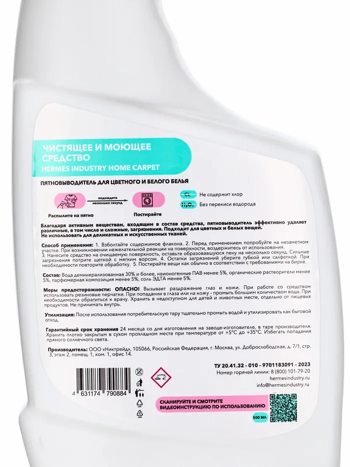 Пятновыводитель Hermes Industry HOME для цветного и белого белья, спрей, 500 мл — это незаменимый помощник для борьбы с пятнами на одежде, который легко и быстро восстанавливает чистоту вашего белья, не повреждая его ткань. С этим пятновыводителем ваш гардероб будет выглядеть как новый: он эффективно удаляет даже самые стойкие загрязнения, такие как масла, пищевые пятна, следы от травы и другие трудновыводимые пятна, сохраняя яркость и белизну тканей.