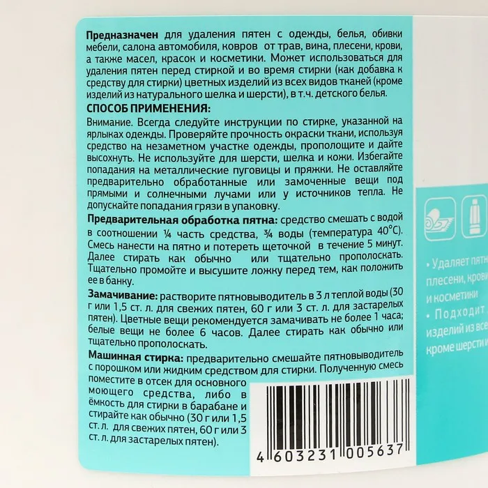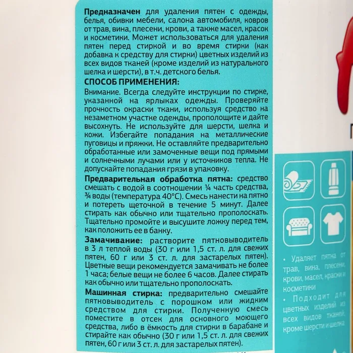 Средство для удаления пятен с одежды, белья, обивки мебели, салона автомобиля, ковров и от трав, вина, плесени, крови, а также масел, красок и косметики. Может использоваться для удаления пятен перед стиркой и во время стирки (как добавка к средству для стирки) цветных изделий из всех видов тканей (кроме изделий из натурального шелка и шерсти) в т.ч. детского белья.