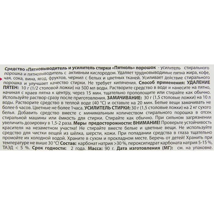 Пятновыводитель Selena "Пятноль", порошок, 90 г — Характеристики