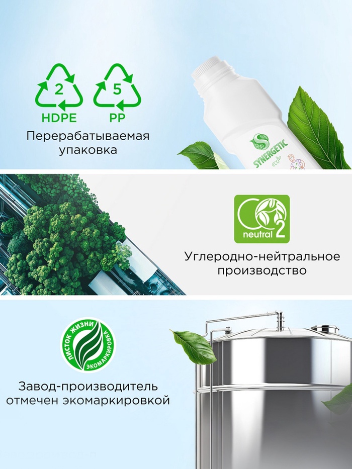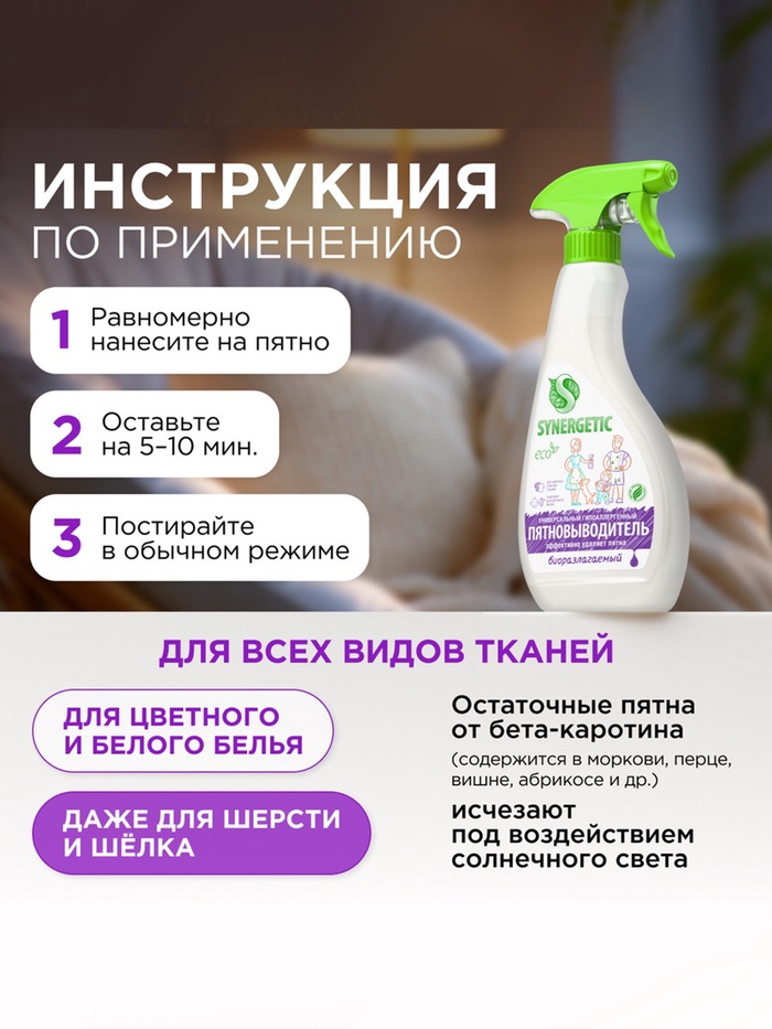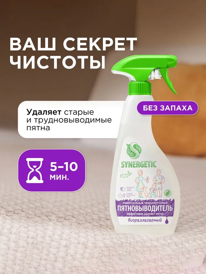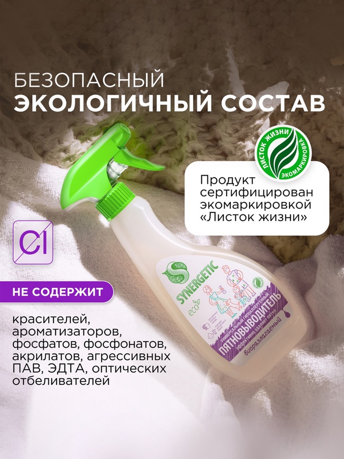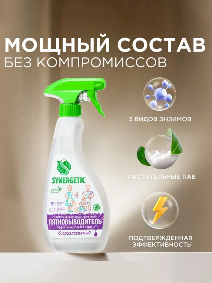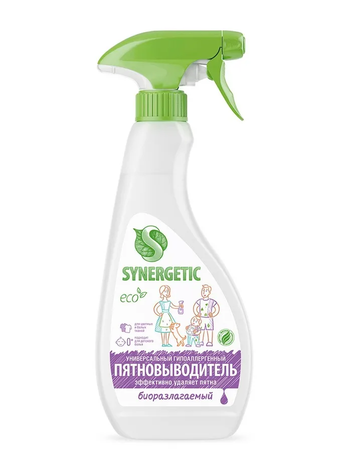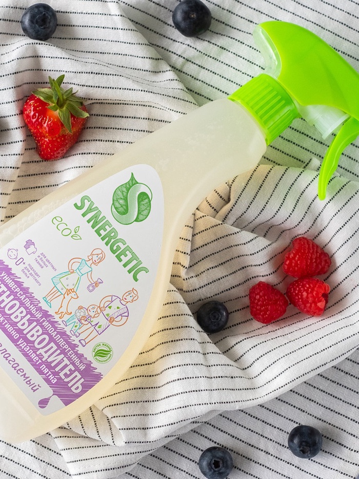 Биоразлагаемый гипоаллергенный пятновыводитель для предварительной обработки пятен SYNERGETIC - универсальное средство для эффективного удаления загрязнений и трудновыводимых пятен с тканей.