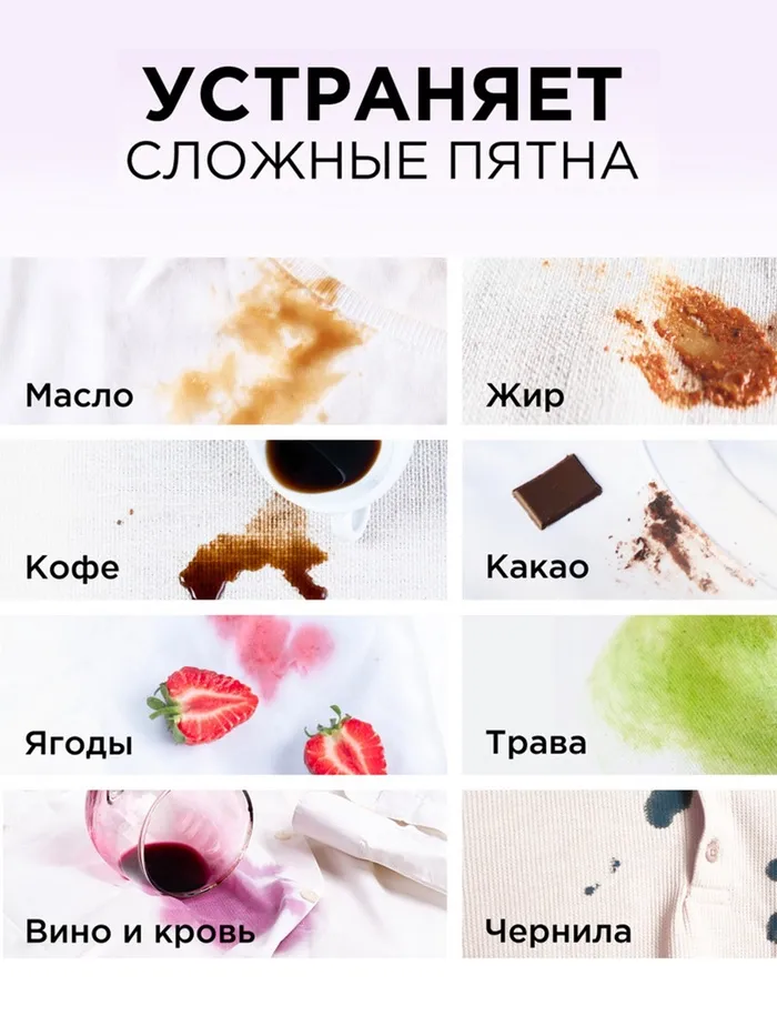 Комбинация пяти видов энзимов (протеаза, амилаза, липаза, маннаназа, целлюлаза) и растительных ПАВ эффективно удаляет въевшиеся загрязнения и застарелые пятна от масла, жира, какао, ягод, травы, чернил, кофе, вина, крови на белом и цветном белье из натуральных и синтетических тканей.