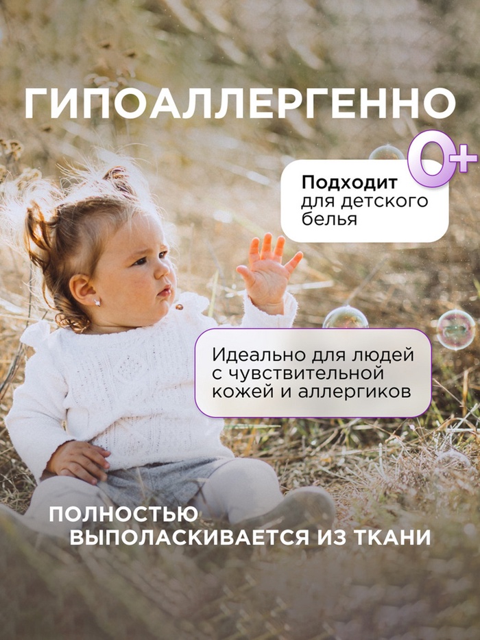 Гипоаллергенный пятновыводитель подходит для детского белья 0+ и одежды людей с чувствительной кожей, а также для деликатных тканей. Средство полностью выполаскивается из волокон и не остается на одежде. Не содержит красителей и ароматизаторов.