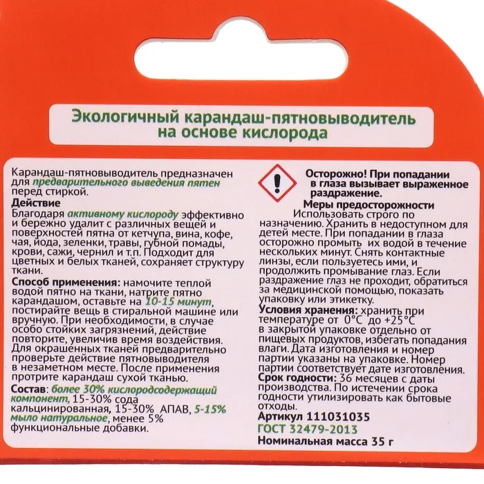 Способ применения: намочите загрязнённый участок тёплой водой, нанесите средство на пятно, слегка потрите до образования пены. Подождите 10–15 минут, затем промойте водой обработанный участок. Не застирывайте. При необходимости повторите, увеличив время действия пятновыводителя. После использования, карандаш протрите сухой тканью.