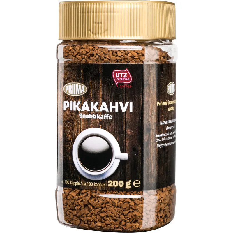 Насладитесь мгновением кофе! Мягкий и ароматный Priima Растворимый кофе освежает ваш день, даже в спешке. Кофе поступает от UTZ-сертифицированных фермеров, которые уважают права работников и применяют более экологически устойчивые методы ведения сельского хозяйства. Упаковки хватает примерно на 100 чашек. Размер упаковки 200 г.