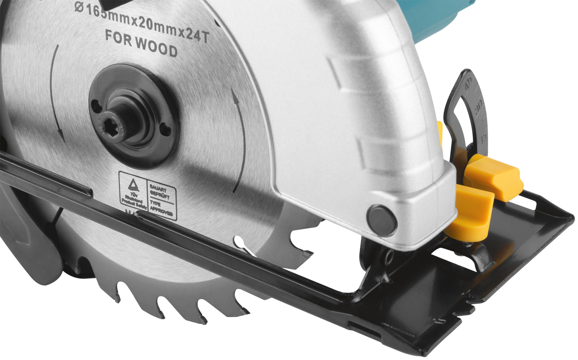 Пила оснащена диском диаметром 165 мм и посадочным отверстием 20 мм, что обеспечивает максимальную точность и чистоту реза. Жёлтая опора гарантирует надежную устойчивость во время работы.