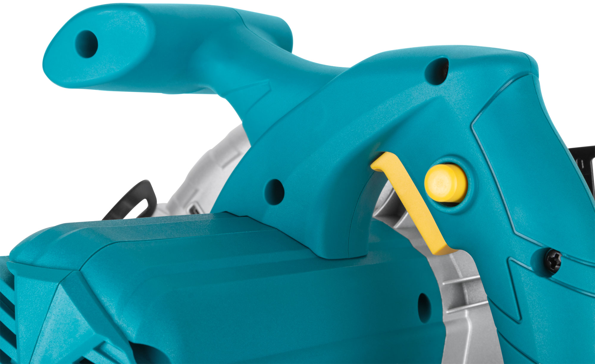 Эта пила оснащена резиновыми накладками для удобства использования, подпружиненным защитным кожухом и регулируемой опорной плитой, что делает её безопасной и эффективной в работе. Конструкция предусматривает блокировку включения для дополнительной безопасности.