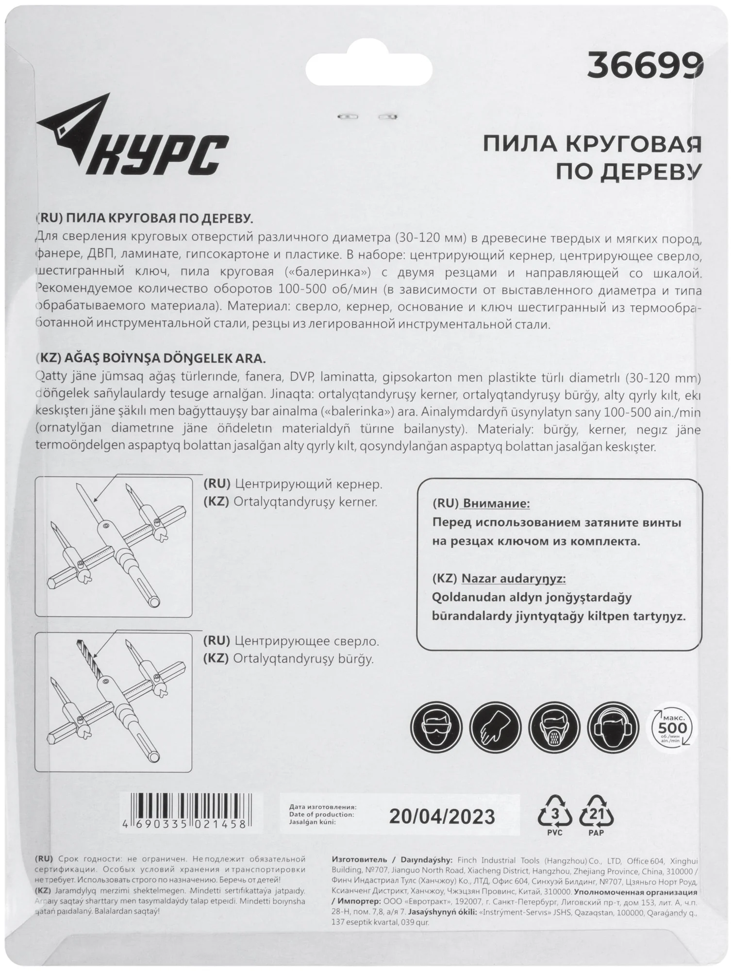 Пила круговая Балеринка 30-120 мм от бренда КУРС, модель 36699, станет незаменимым инструментом для мастеров, работающих с гипсокартоном и деревом. Эта пила позволяет точно и быстро высверливать отверстия нужного размера, что особенно полезно при монтаже светильников, вентиляционных решеток и других элементов.