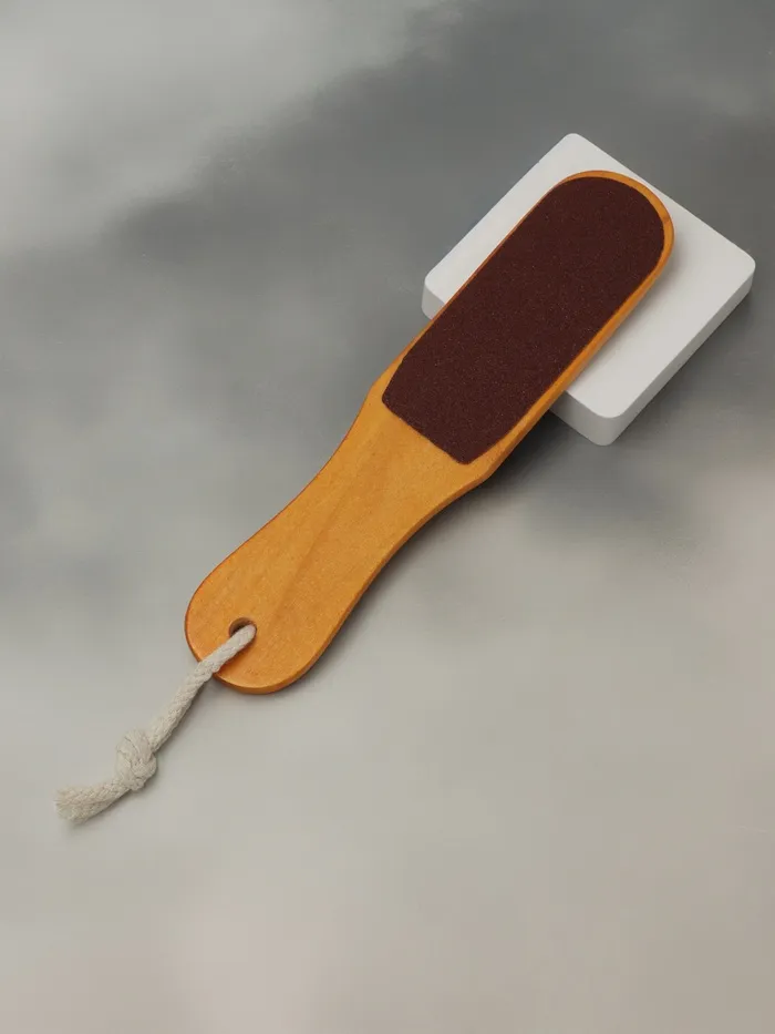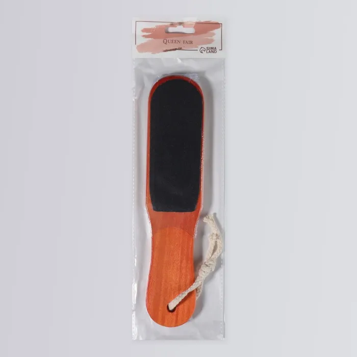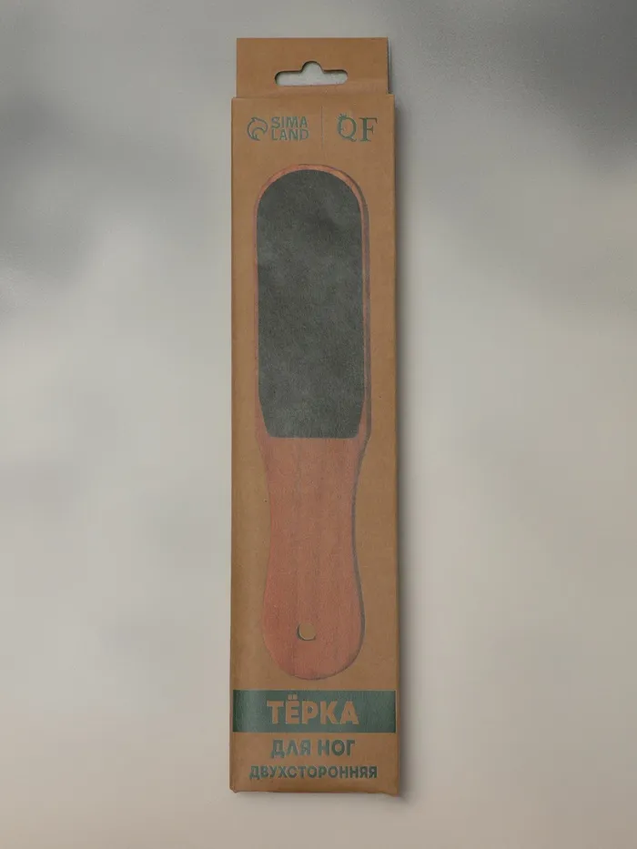 Представляем Вам двустороннюю тёрку для пяток торговой марки QF для домашнего и профессионального использования. Наша пилка для пяток из дерева обработана влагостойким лаком и имеет 2 абразивные стороны.