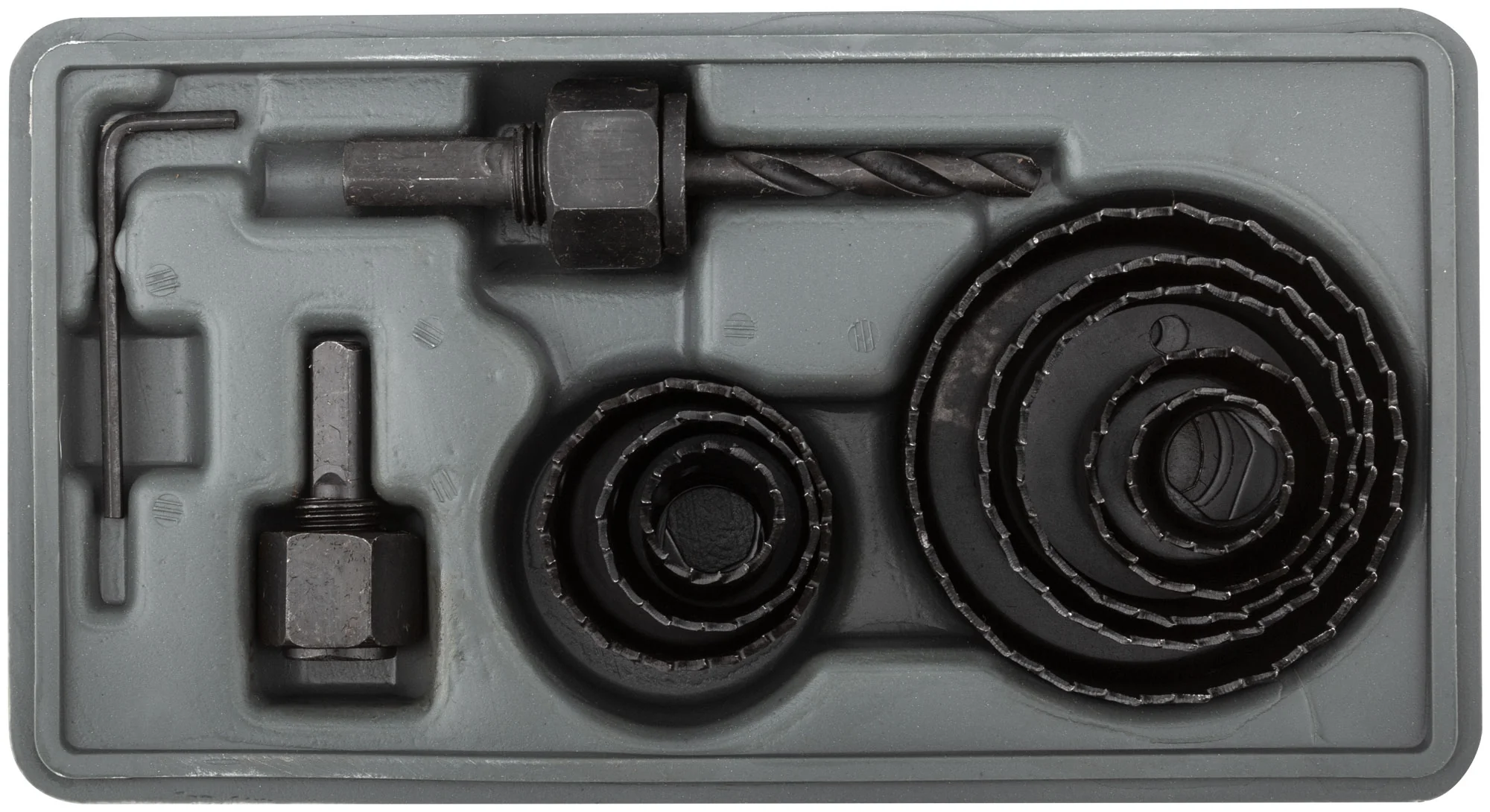 Пластиковый кейс обеспечивает удобное хранение и транспортировку, позволяя всегда иметь все необходимое под рукой. В набор входят размеры: 19, 22, 29, 32, 38, 44, 51 и 64 мм, что делает его универсальным для различных работ.