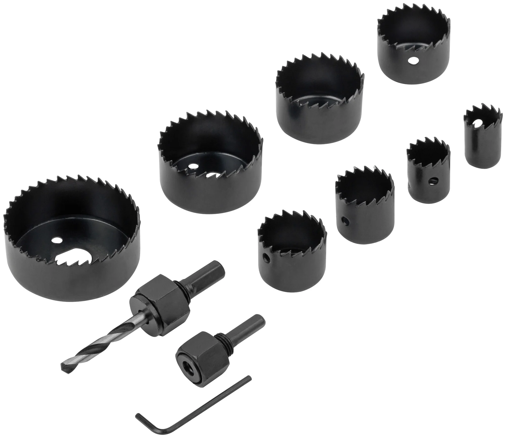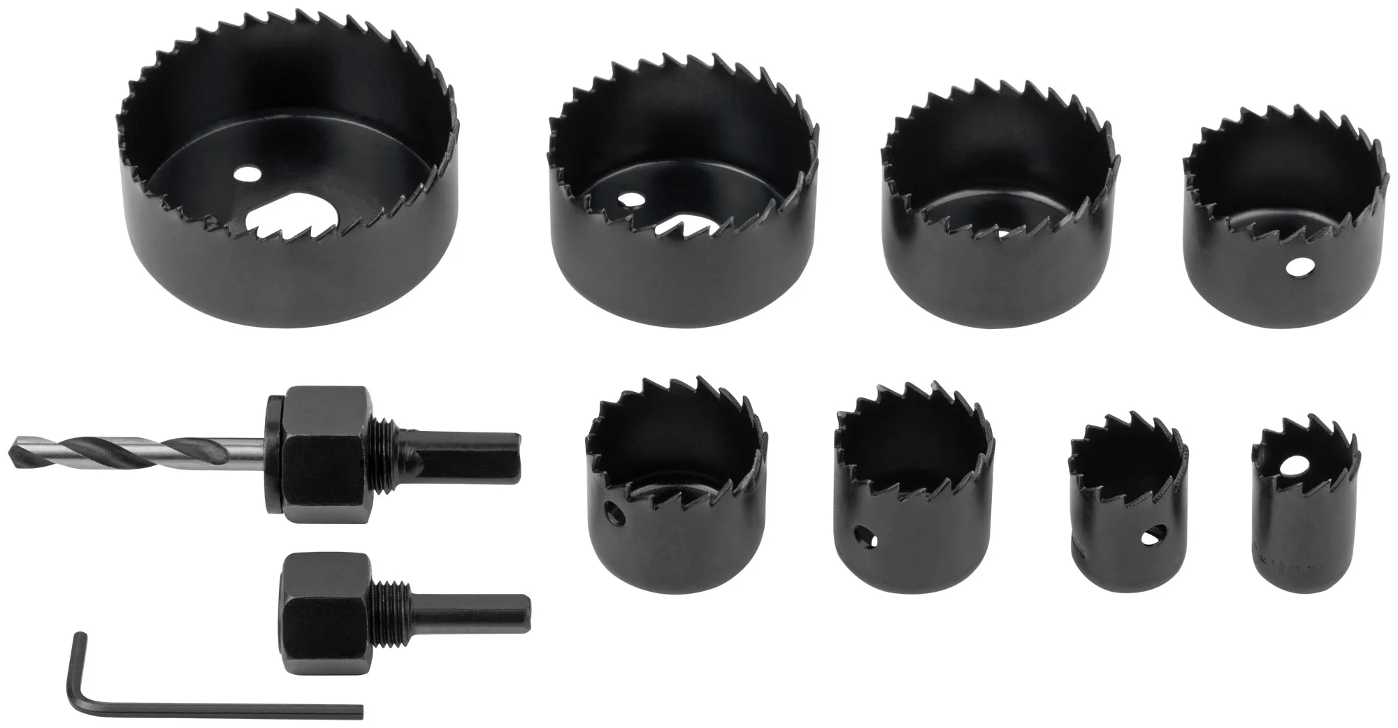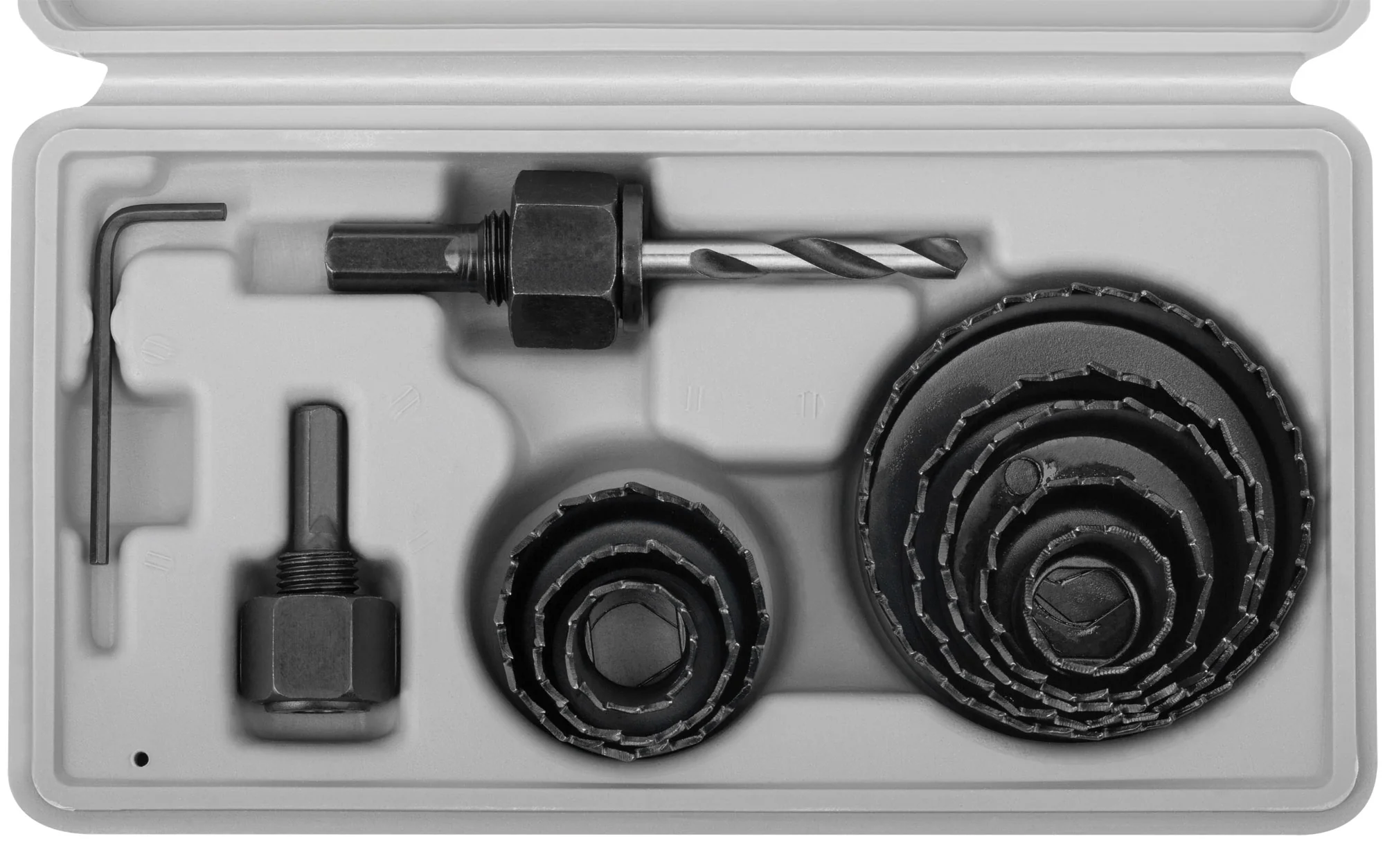 В комплекте восемь пил диаметром от 19 до 64 мм, что позволяет работать с материалами различной толщины и плотности. Все элементы изготовлены из термообработанной усиленной инструментальной стали, что обеспечивает долговечность и надежность инструмента.