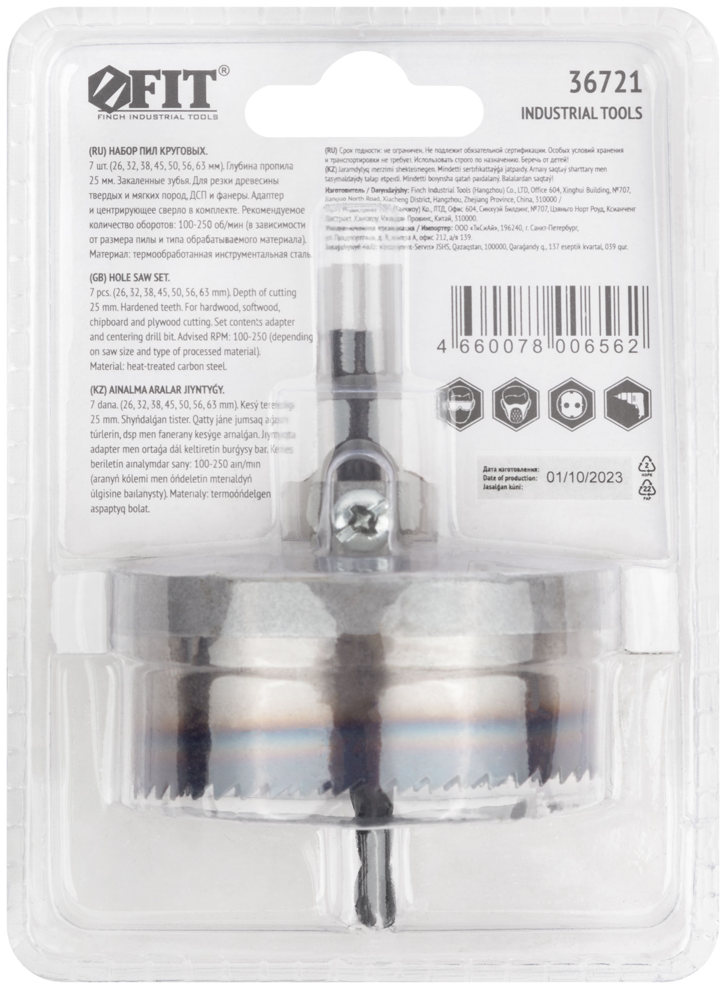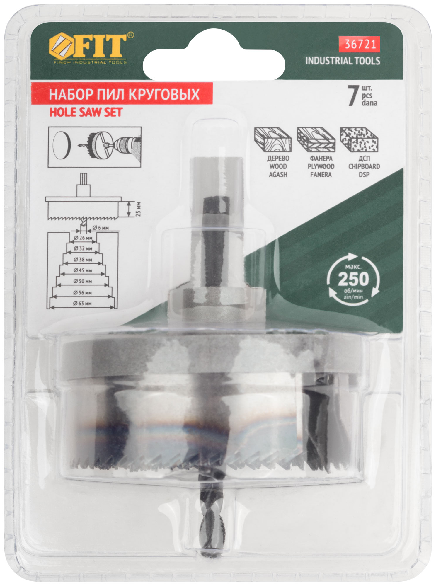 Набор круговых пил FIT 36721 станет незаменимым помощником для мастеров, работающих с древесиной различных пород. Благодаря разнообразию диаметров от 26 до 63 мм, вы сможете легко высверливать отверстия нужного размера в ДСП, фанере и твердых породах древесины.