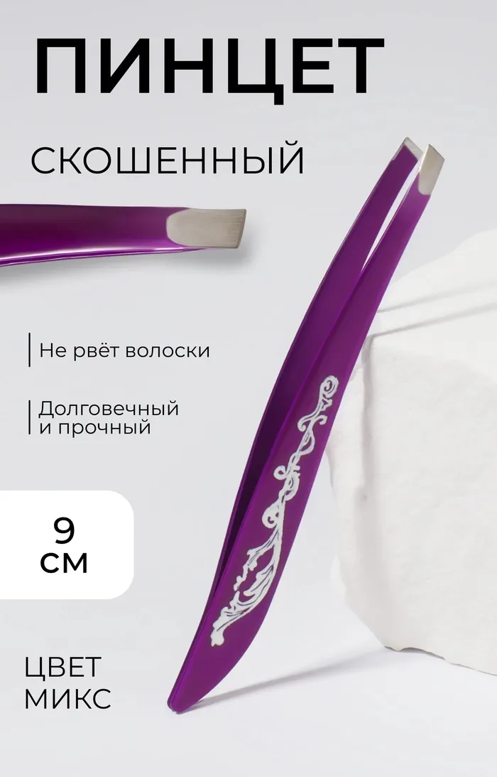 Пинцет скошенный, узкий, с рисунком, 9 см, МИКС — Характеристики