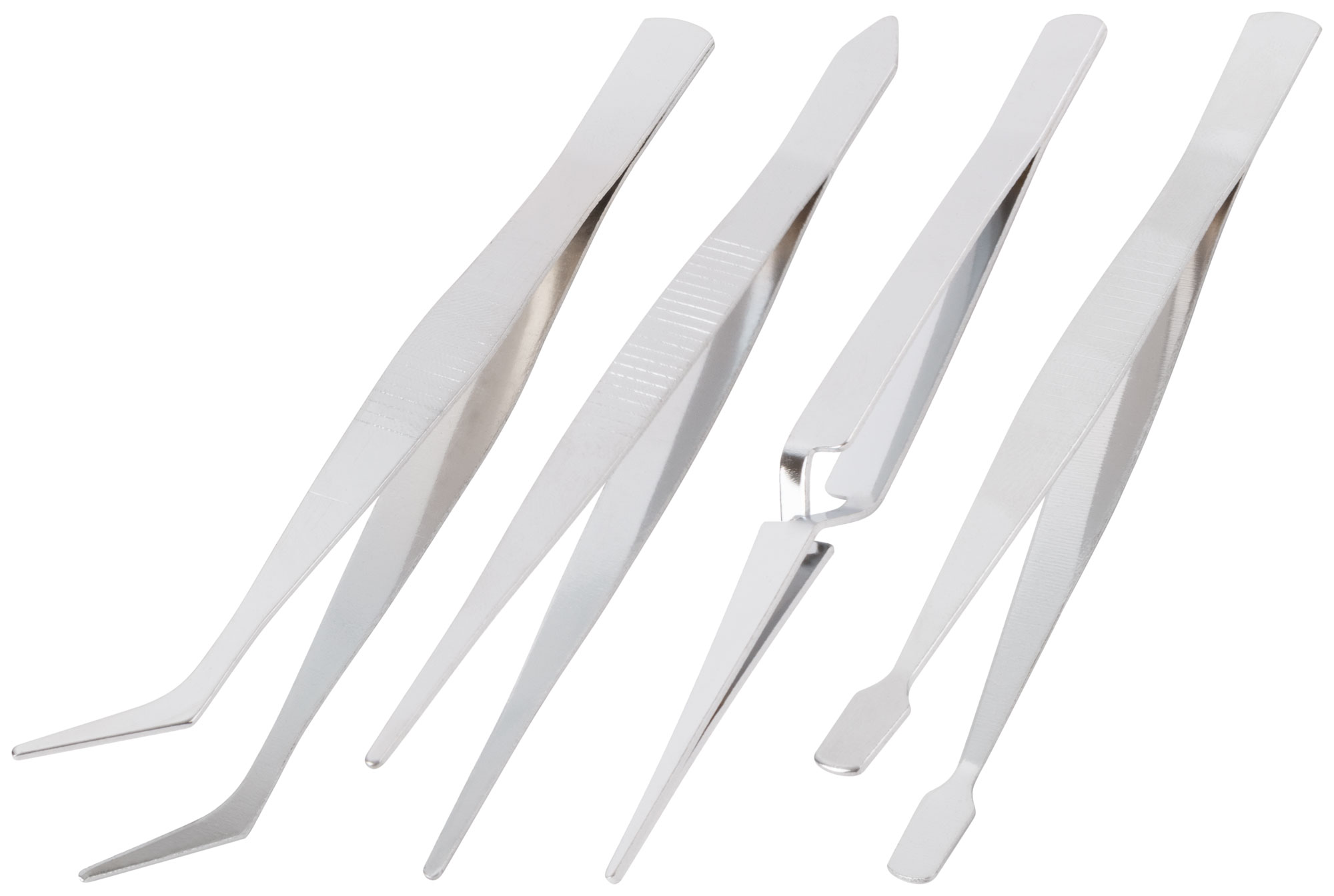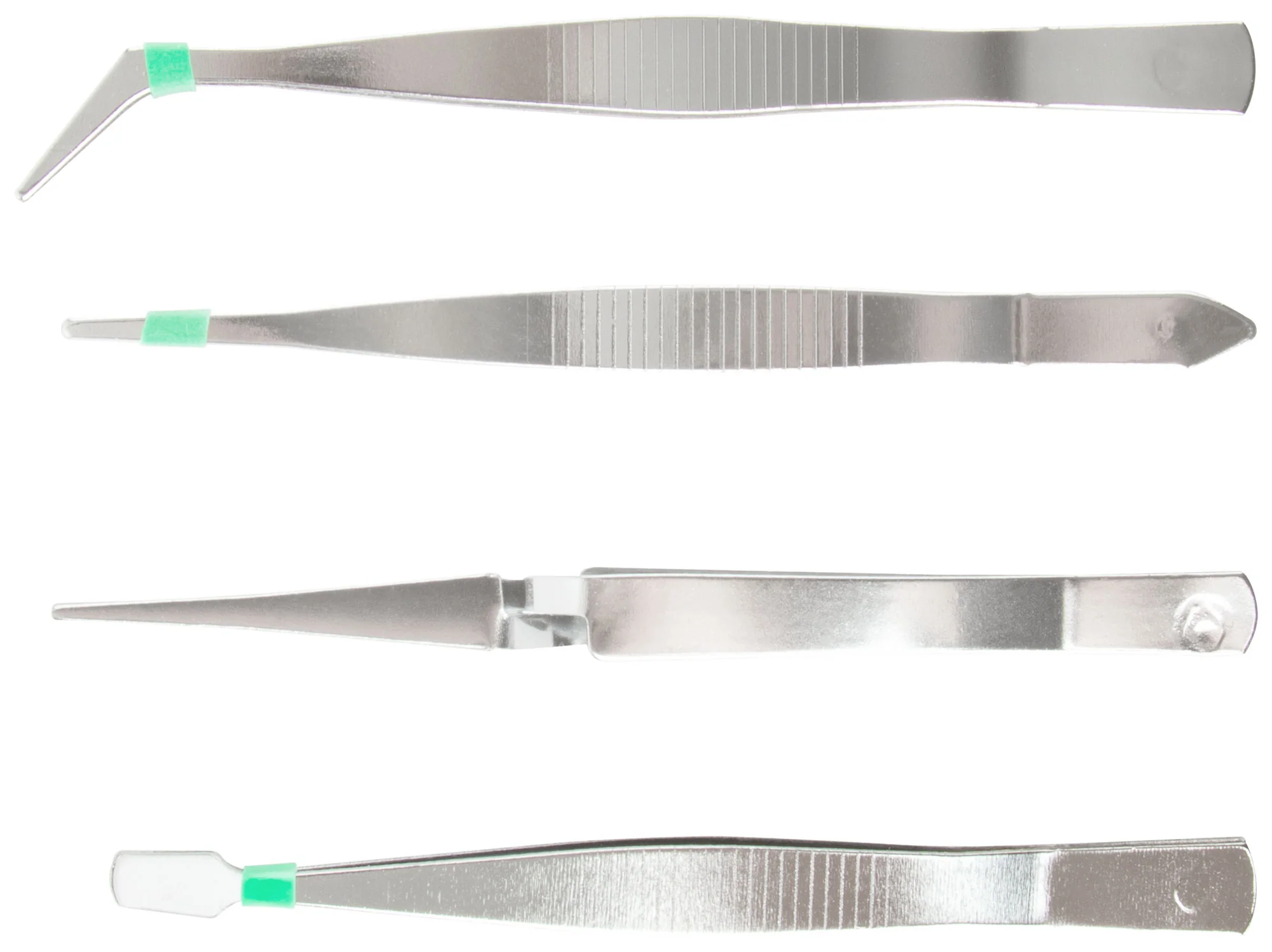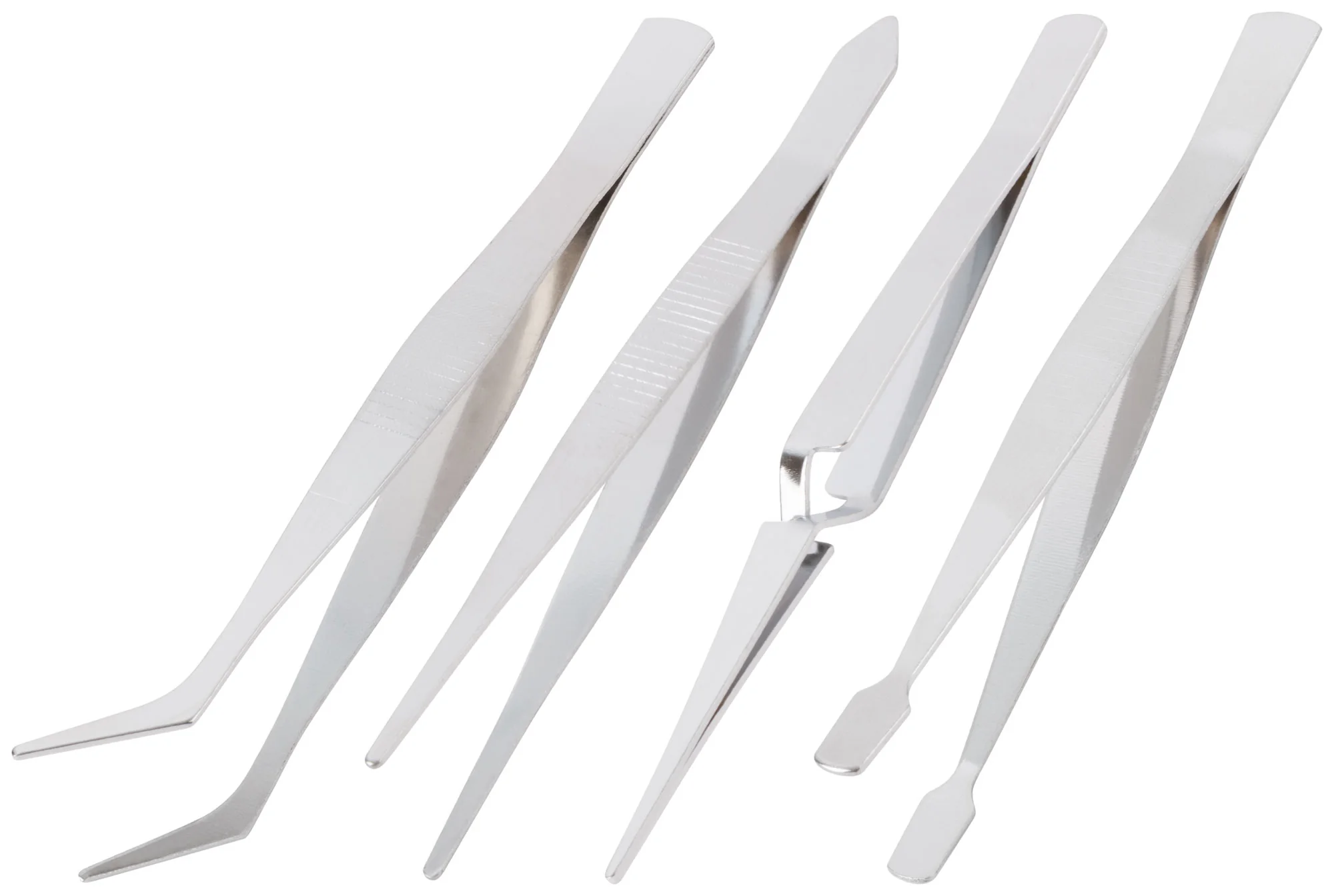 В набор входит четыре вида пинцетов, каждый из которых изготовлен из прочной инструментальной стали. Вы получите прямой пинцет, пинцет с изогнутым широким захватом, пинцет с захватом под углом 45° и пинцет обратного действия. Такая комбинация обеспечивает максимальную гибкость и удобство в работе.