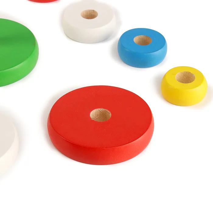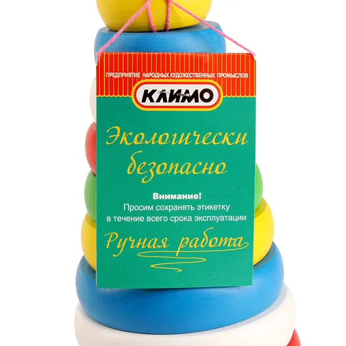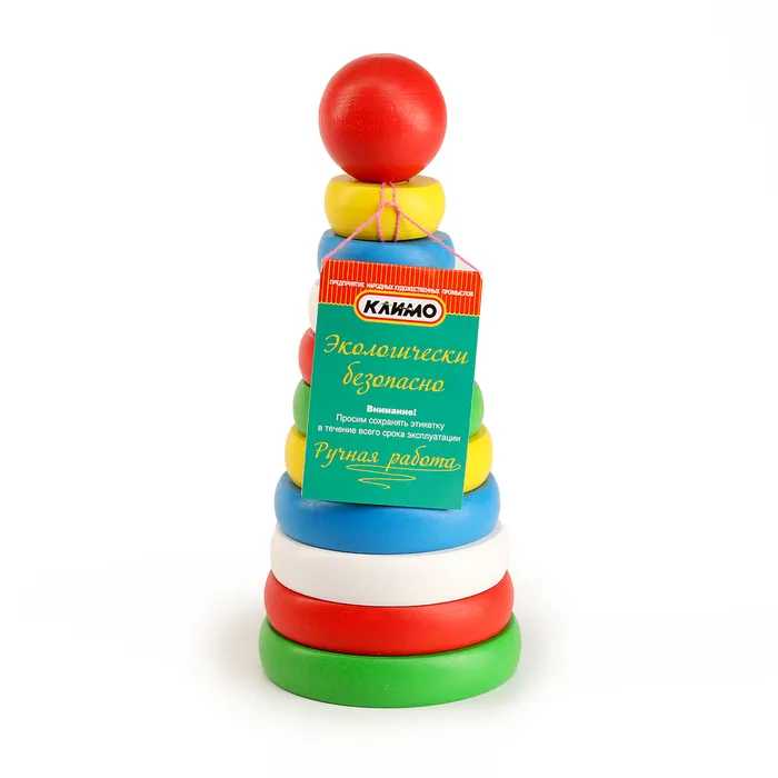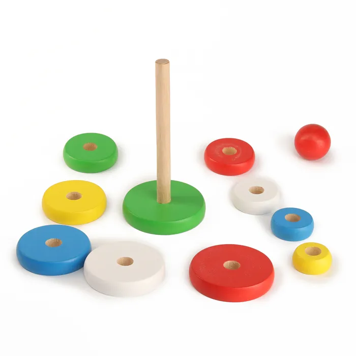 - Состоит из 11 деревянных колец разного размера и цвета, которые легко складываются на стержень.