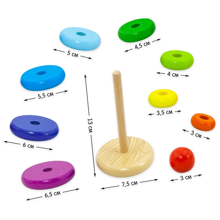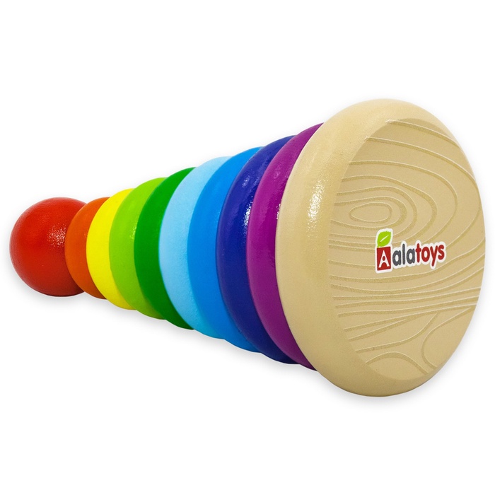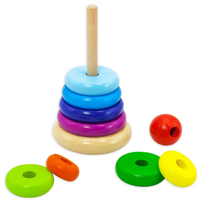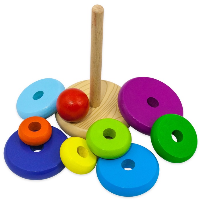 - Понятная логика игры: Ребёнок поочерёдно нанизывает кольца, соотнося их по размеру. Так формируется представление о последовательности и иерархии — от большего к меньшему.