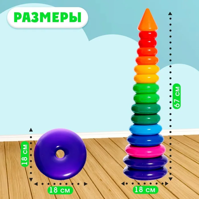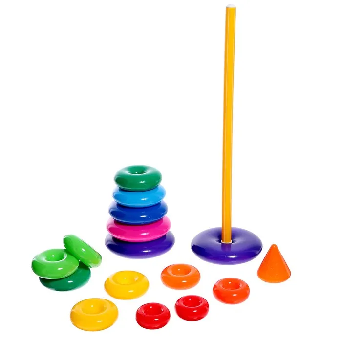Пирамидка — одна из первых развивающих игрушек малыша. Состоит из основы-стержня, круглых колец с цифрами и наконечника в виде конуса.