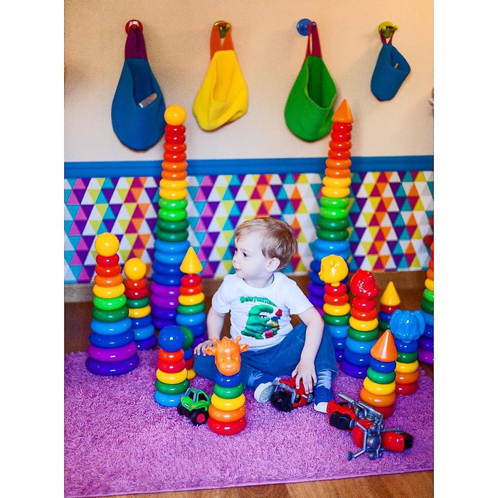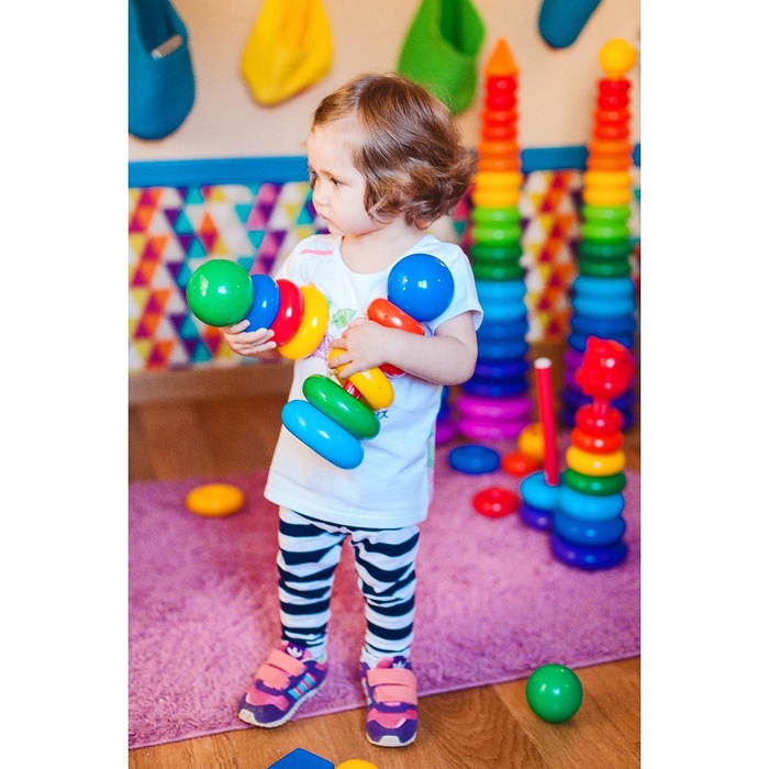 Каждое кольцо разного цвета и пронумеровано. Собирая пирамидку, ребёнок освоит основные цвета радуги и получит базовые навыки счёта. Игры с красочной пирамидкой разовьют у крохи мелкую моторику, координацию движений, воображение, логическое и образное мышление, навыки конструирования. Он научится различать предметы по величине, сравнивать их и делать выводы. Также юный конструктор познакомится с такими понятиями, как «больше», «меньше», «круг», «конус», «плоский», «объёмный».