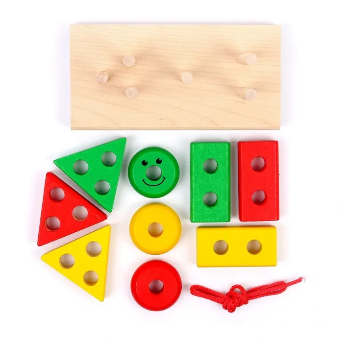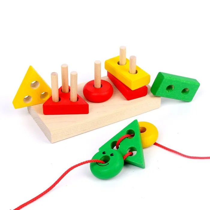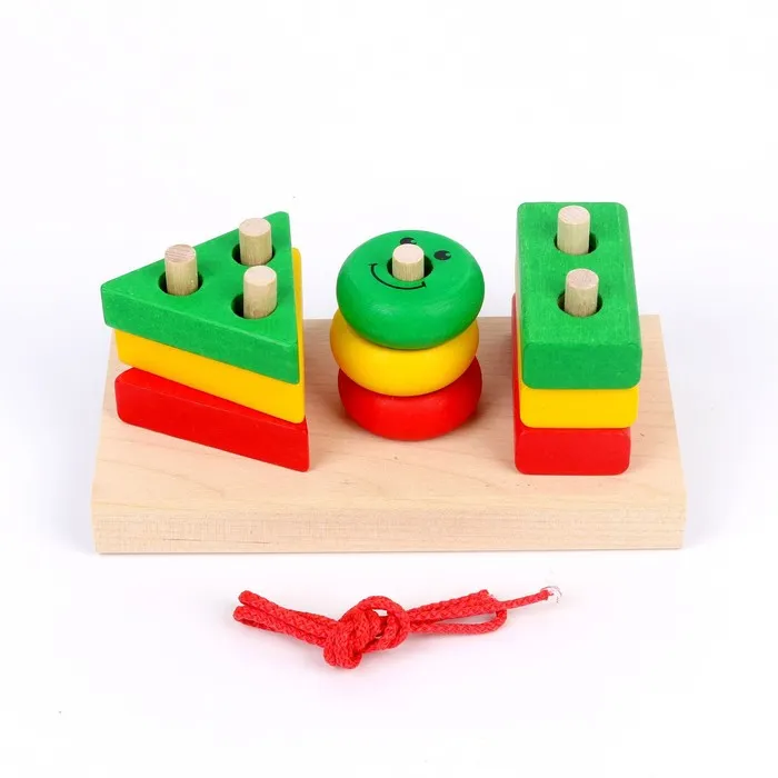 - Задача малыша — правильно подобрать деталь по количеству отверстий и надеть её на столбики.