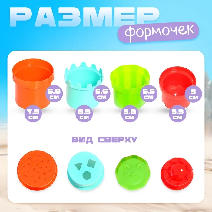 Набор подходит для игр дома, на улице и в песочнице. Лёгкие стаканчики удобно брать с собой на прогулку или в поездку, а прочный пластик легко моется и не боится влаги.