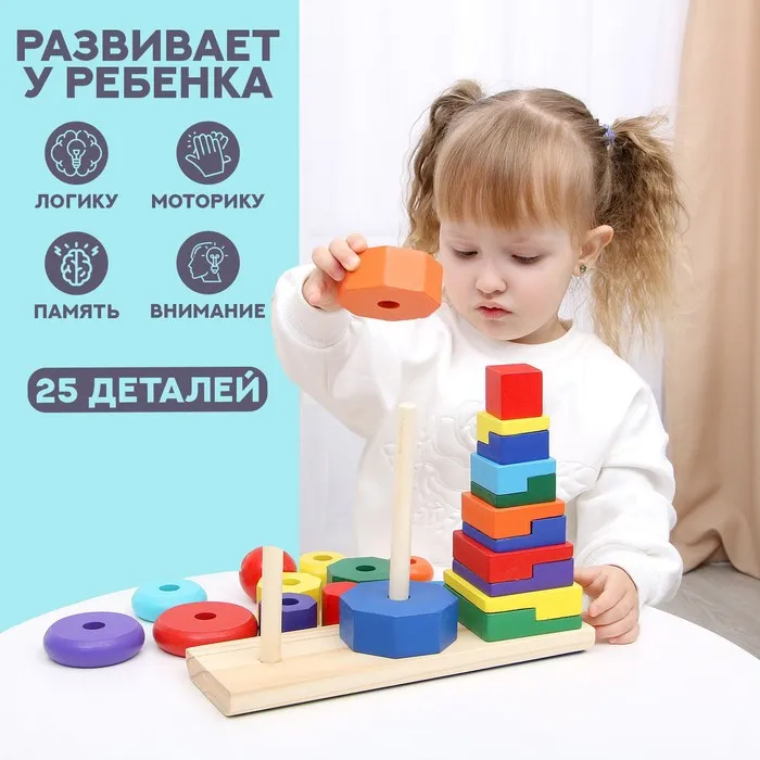 Собирая пирамидки, ребёнок учится различать цвета, формы и размеры, развивает логическое мышление и координацию движений. Игрушка помогает освоить базовые навыки сортировки и знакомит с понятиями «больше», «меньше», «выше», «ниже». Это отличный способ провести время с пользой и подготовиться к школе.