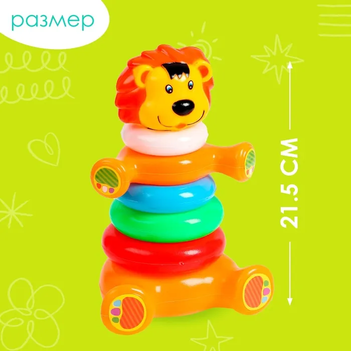 Пирамидка — одна из первых развивающих игрушек малыша. Состоит из основы-стержня, круглых колец, колец с лапками и наконечника в виде головы льва.