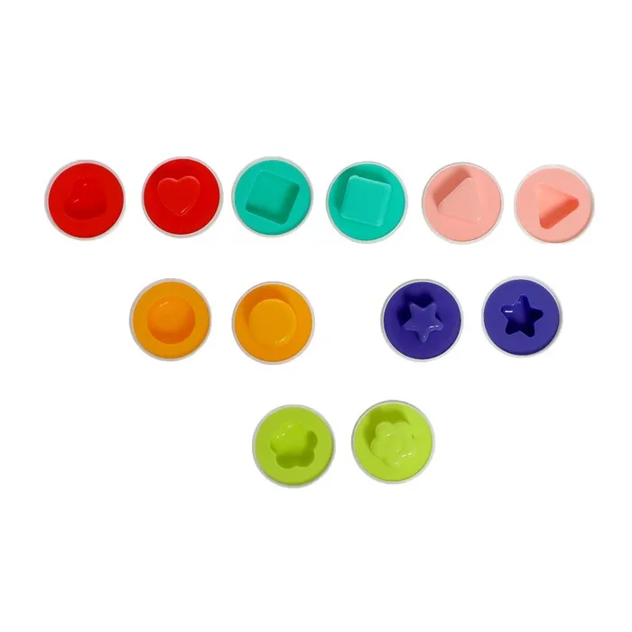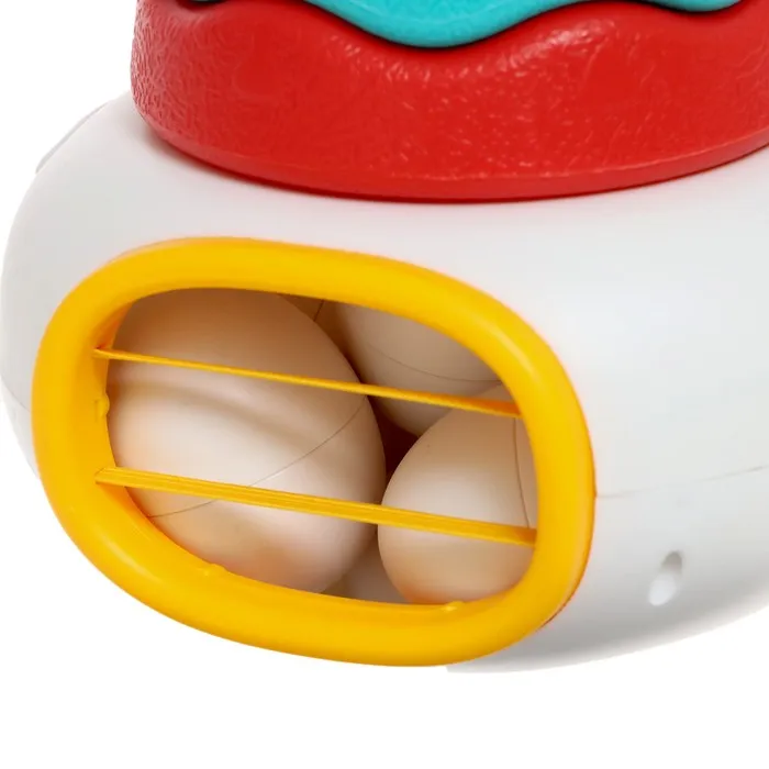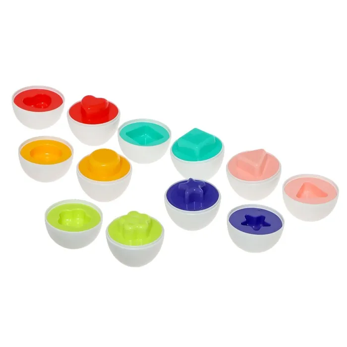 - 6 яичек-сортеров с фигурами внутри — малышу предстоит подобрать отверстие, подходящее по форме. Это первые логические задачи, которые тренируют мышление и зрительно-моторную координацию.