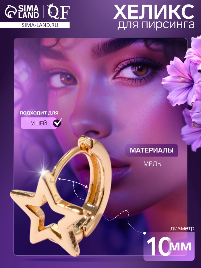 Пирсинг хеликс в ухо «Звезда», d=10 мм, цвет золото — Характеристики