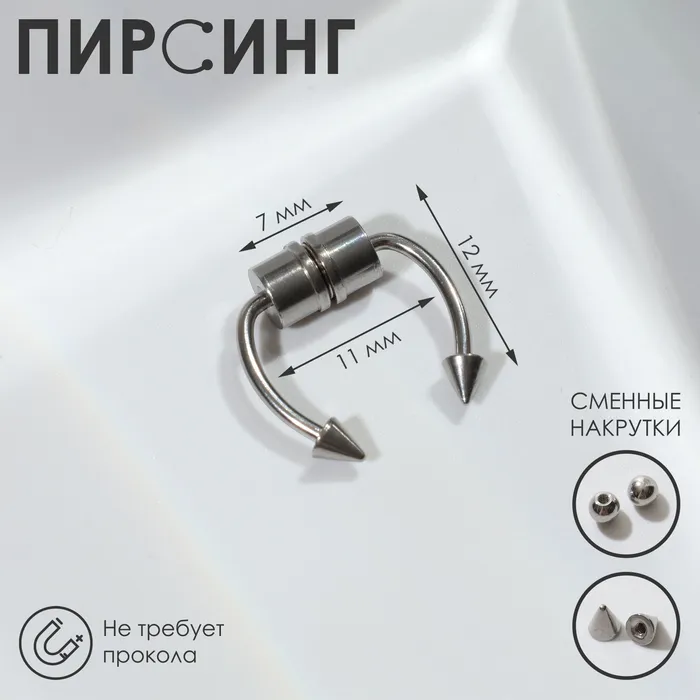 Изготовленный из прочной стали с серебристым покрытием, он обладает стильным внешним видом и высокой долговечностью. Сменные насадки позволяют менять внешний вид по настроению или под конкретный образ, а отсутствие вставок делает его более универсальным и подходящим для различных тематик подарков или повседневного использования. Такой пирсинг отлично подойдет как для взрослых, так и для тех, кто ценит комфорт и оригинальность в украшениях.