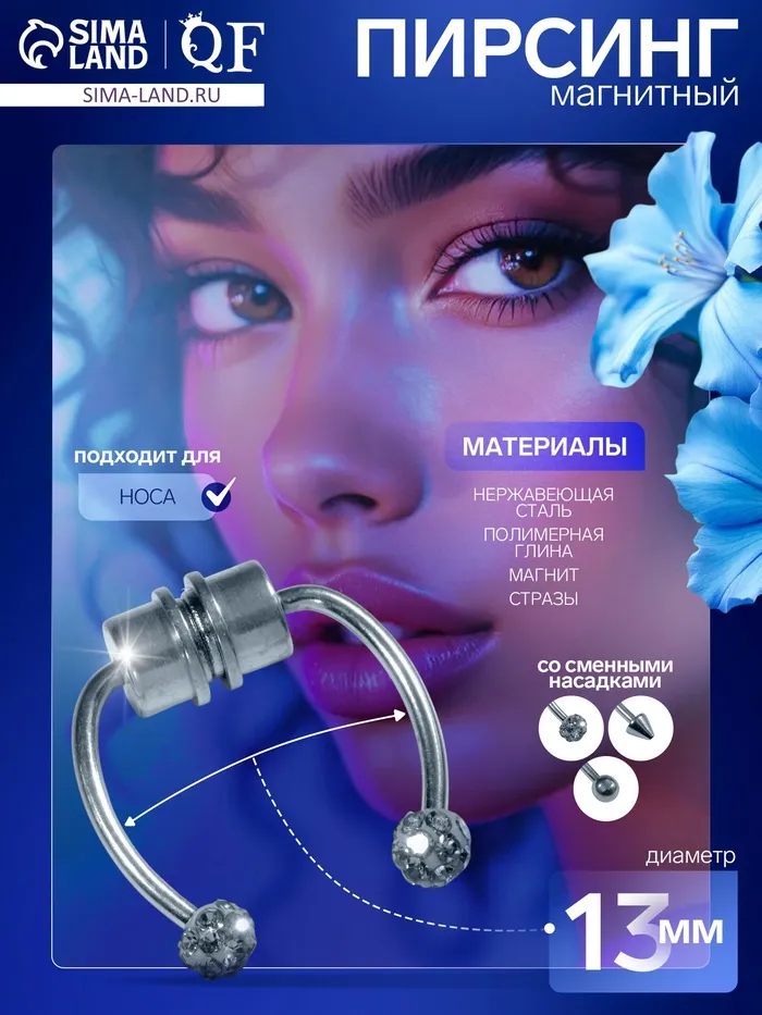 Этот фейковый пирсинг в нос с магнитной фиксацией и сменными насадками предлагает уникальное сочетание комфорта и стиля для женщин, желающих экспериментировать с образом без постоянных процедур. Его длина 17 мм идеально подходит для имитации настоящего украшения, создавая эффект натурального носового пирсинга, при этом не вызывая дискомфорта или необходимости прокалывать кожу. Благодаря сменным насадкам из полимерной глины и стразам, вы можете легко менять внешний вид, добавляя блеска или делая образ более сдержанным.