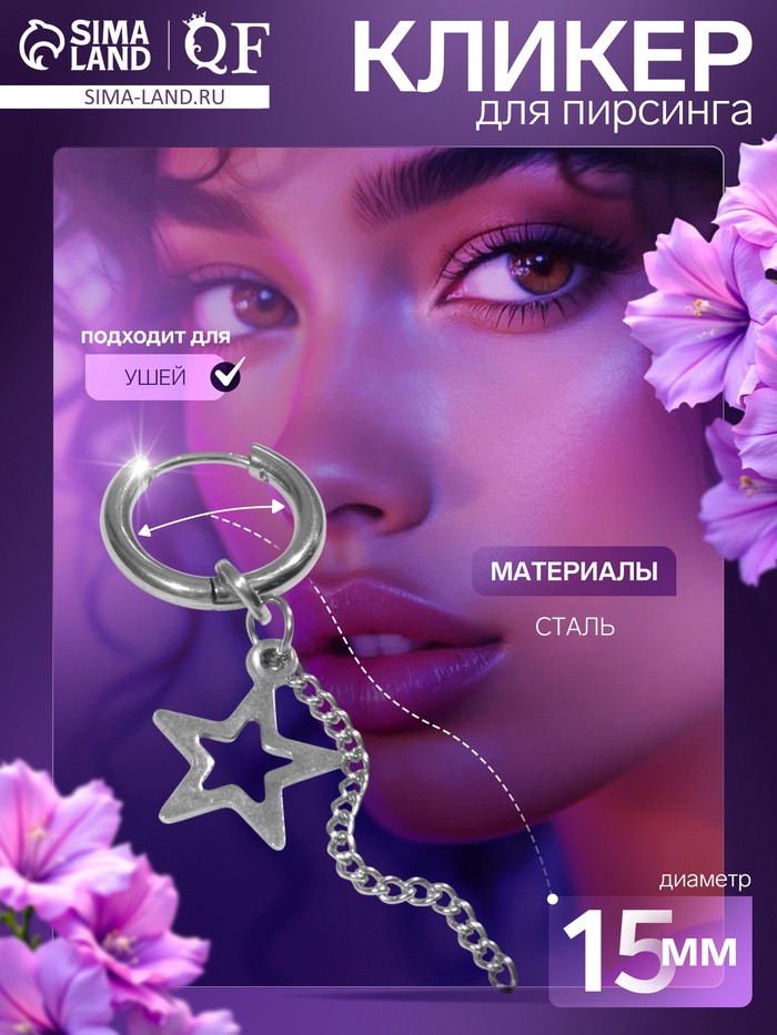 Пирсинг в ухо «Кольцо» звезда с цепью, d=15 мм, цвет серебро — Характеристики