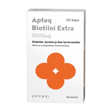Apteq Biotiini Extra богат биотином (5000 мкг), который важен для волос, ногтей и кожи. Кроме того, Biotiini Extra содержит цинк в хорошо усваиваемой форме бисглицината. Метионин активирует синтез кератина и способствует усвоению биотина. Витамин В6 способствует нормальной выработке цистеина. Цистеин является природным компонентом кератина, структурного вещества для волос. Пантотеновая кислота (В5) является важным ингредиентом для естественного процесса регенерации клеток. Экстракт бамбука является богатым источником натурального кремния, полезного для роста волос, ногтей и улучшения качества кожи.