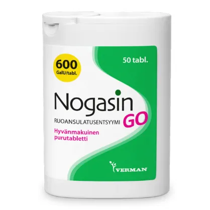 Nogasin GO содержит альфа-галактозидазу (природный фермент), который помогает переваривать пищеварительные углеводы из овощей и зерновых продуктов, содержащих неперевариваемые углеводы, в желудочно-кишечном тракте и, таким образом, уменьшает вздутие живота и газообразование.