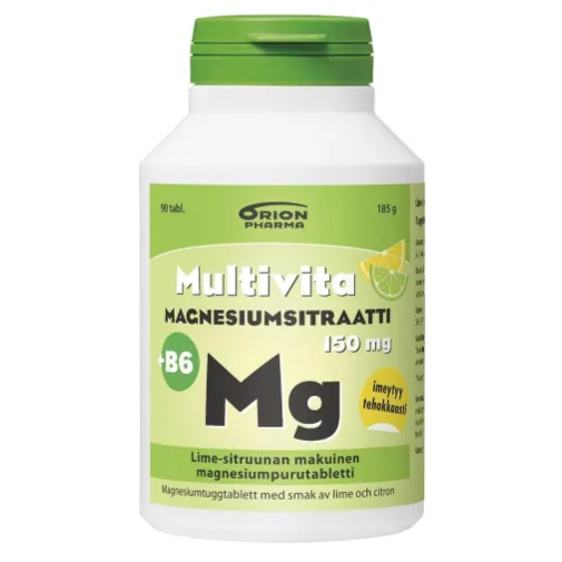 Multivita Magnesiumsitraatti +B6 - это высокоусваиваемый цитрат магния со вкусом лайма и лимона.